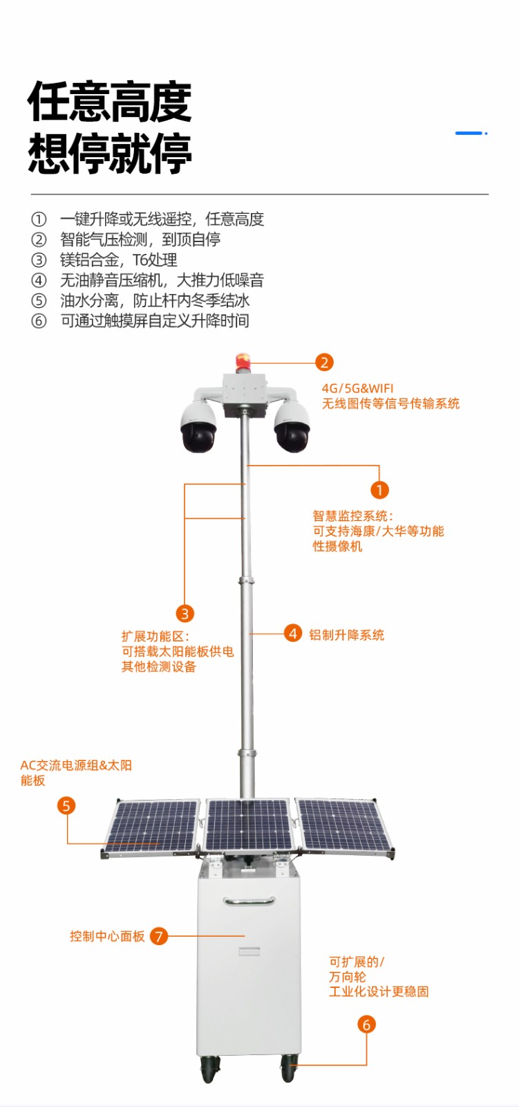 友聯(lián)哨兵多功能移動兵站(輕便型小哨兵移動監(jiān)控)是一款十分靈活的中小型移動監(jiān)控設(shè)備,自帶網(wǎng)電,具備較高的機動性,系統(tǒng)可集高清視頻監(jiān)控、照明、報警、廣播、對講、氣象環(huán)境監(jiān)測、存儲、控制、無線傳輸、一鍵升降等功能于一體,并可具備市電、太陽能等多種能源補給方式,提升續(xù)航時間,以適應(yīng)各類復(fù)雜的環(huán)境。戶外使用,不懼風(fēng)雨,隨需移動,循環(huán)利用。可廣泛用于石油管道巡檢、工地監(jiān)控、電力維修監(jiān)控、活動安防、戶外作業(yè)等臨時監(jiān)控或長期監(jiān)控。