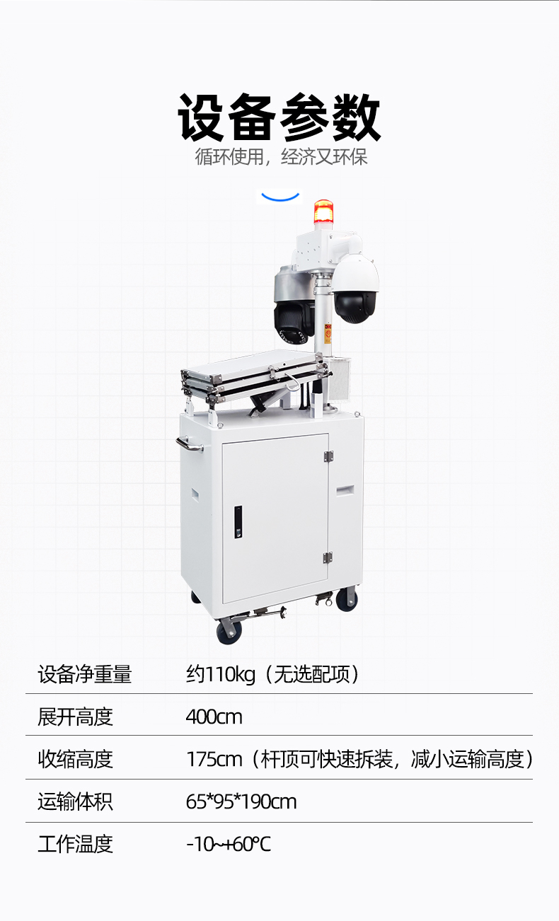 小哨兵移動監(jiān)控系統(tǒng)太陽能電池供電超長續(xù)航便捷監(jiān)控 友聯(lián)哨兵多功能移動兵站(輕便型小哨兵移動監(jiān)控)是一款十分靈活的中小型移動監(jiān)控設(shè)備,自帶網(wǎng)電,具備較高的機動性,系統(tǒng)可集高清視頻監(jiān)控、照明、報警、廣播、對講、氣象環(huán)境監(jiān)測、存儲、控制、無線傳輸、一鍵升降等功能于一體,并可具備市電、太陽能等多種能源補給方式,提升續(xù)航時間,以適應(yīng)各類復(fù)雜的環(huán)境。戶外使用,不懼風(fēng)雨,隨需移動,循環(huán)利用。可廣泛用于石油管道巡檢、工地監(jiān)控、電力維修監(jiān)控、活動安防、戶外作業(yè)等臨時監(jiān)控或長期監(jiān)控。