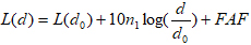 式中,n1 是位于同一樓層上的路徑損耗指數(shù),它取決于建筑物的類型,其典型值是2.8;FAF 是樓層衰減因子,它是樓層數(shù)和建筑物類型的函數(shù)。