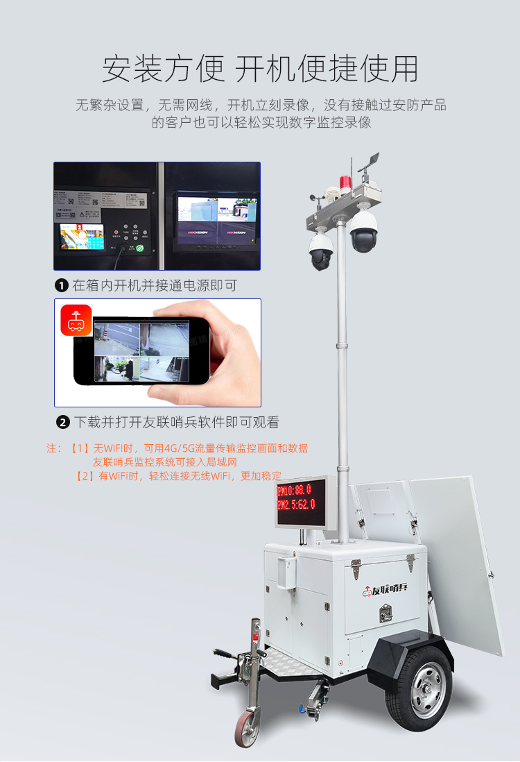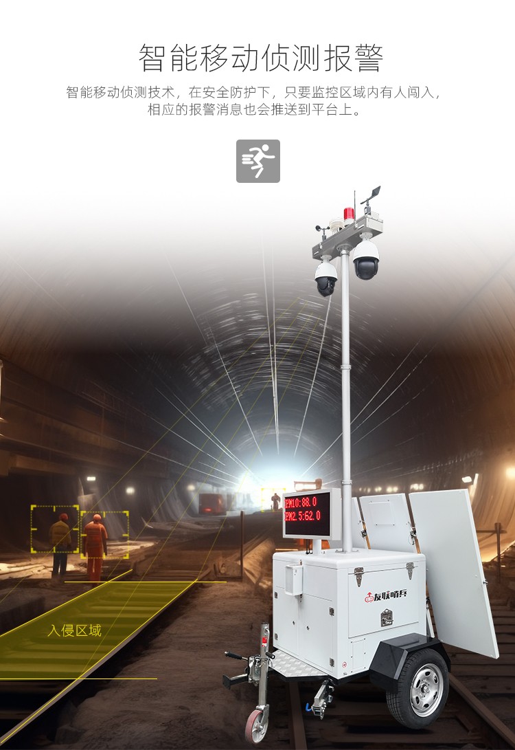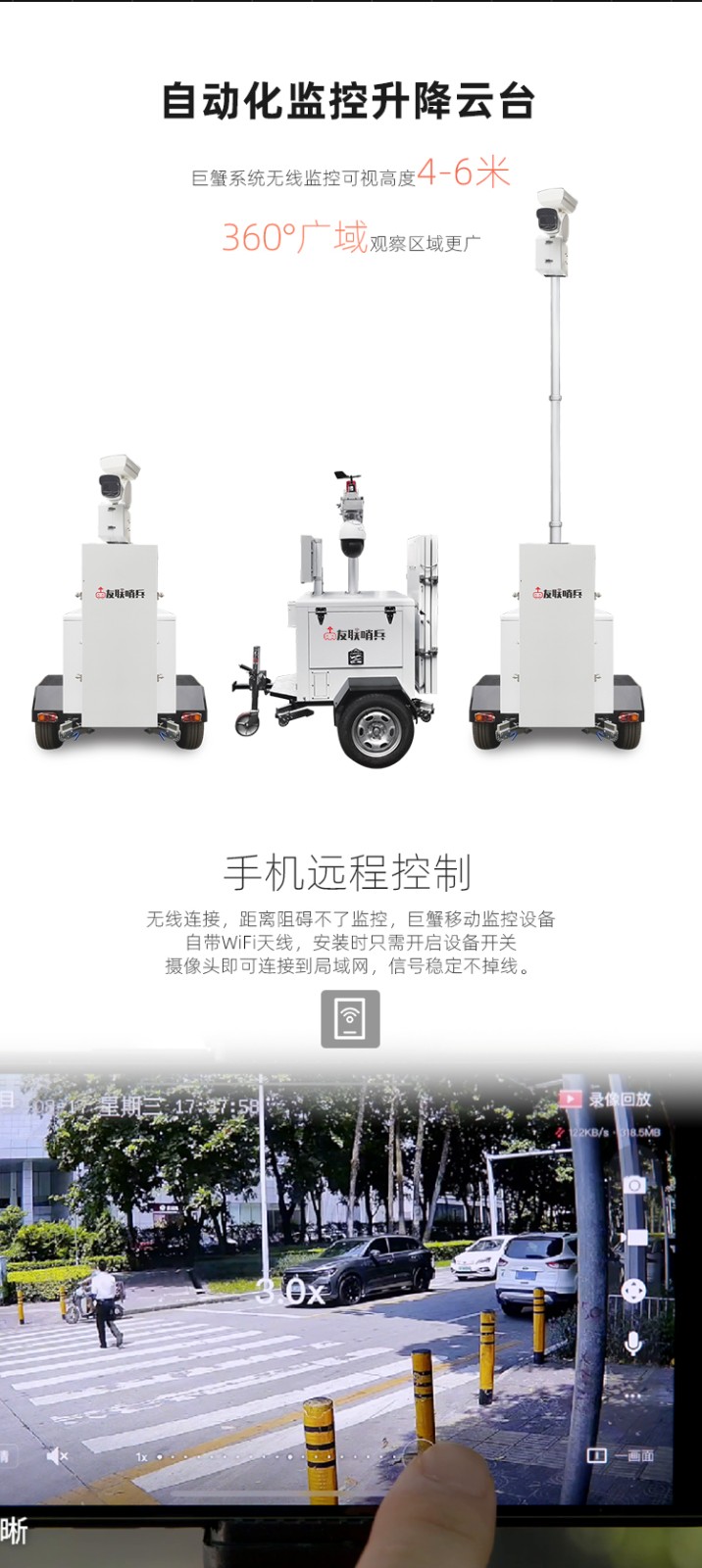 友聯(lián)哨兵雙目太陽能移動(dòng)監(jiān)控 ULS-FG 友聯(lián)哨兵ULS-FG系列太陽能移動(dòng)監(jiān)控系統(tǒng),采用加厚金屬機(jī)身設(shè)計(jì),集監(jiān)控、升降、供電、控制、存儲(chǔ)和終端顯示于一體,通用性及耐用性更強(qiáng);拖掛式運(yùn)輸轉(zhuǎn)場(chǎng)方式,滿足快速靈活部署需求;結(jié)合風(fēng)能、太陽能、蓄電池、市電等互補(bǔ)供電方式,無線網(wǎng)絡(luò)傳輸為主,無網(wǎng)無電的環(huán)境適用;搭載400萬360°無死角智能高清監(jiān)控?cái)z像機(jī),透霧性能強(qiáng),拍攝不受線和天氣影響;可加選AI功能,滿足客戶智能化識(shí)別需求。