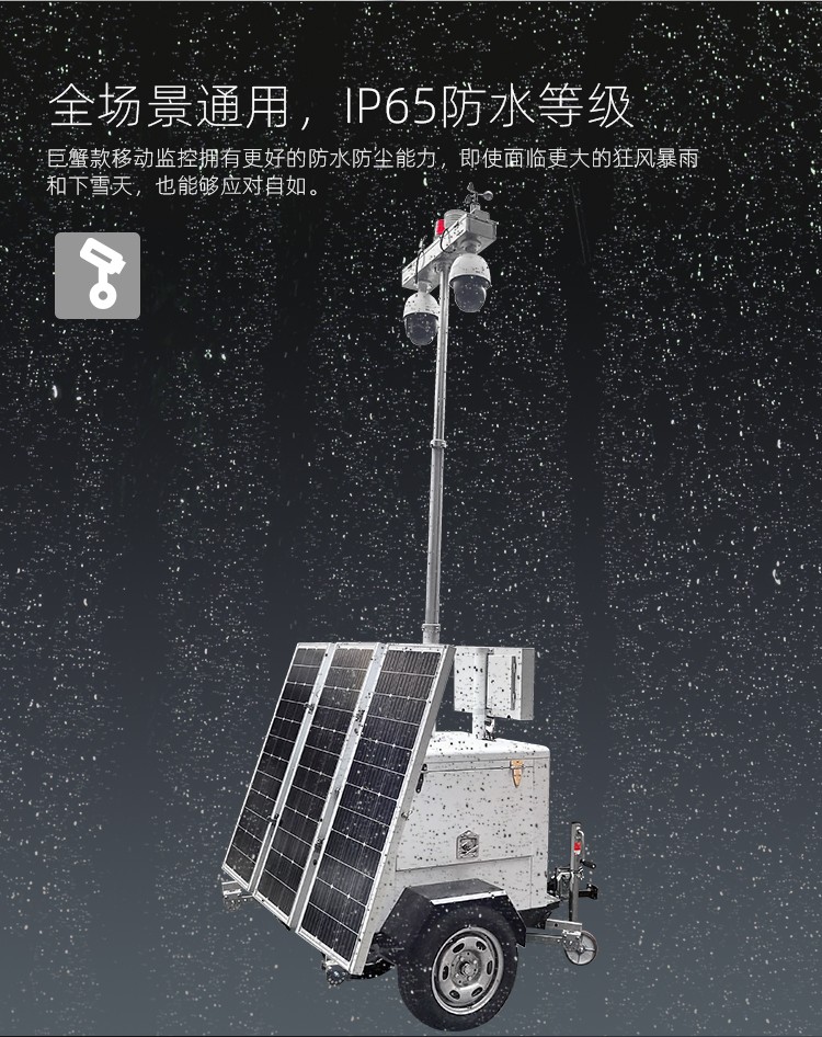 工地?fù)P塵氣象監(jiān)測(cè)太陽能移動(dòng)監(jiān)控車 友聯(lián)哨兵巨蟹款太陽能供電工地?fù)P塵氣象監(jiān)測(cè)移動(dòng)監(jiān)控車(系統(tǒng)),自帶網(wǎng)電,具備較高的機(jī)動(dòng)性,系統(tǒng)可集高清視頻監(jiān)控、照明、報(bào)警、廣播、對(duì)講、氣象環(huán)境監(jiān)測(cè)(選配)、存儲(chǔ)、控制、無線傳輸、一鍵升降等功能于一體,并可具備市電、太陽能等多種能源補(bǔ)給方式,提升續(xù)航時(shí)間,以適應(yīng)各類復(fù)雜的環(huán)境。戶外使用,不懼風(fēng)雨。